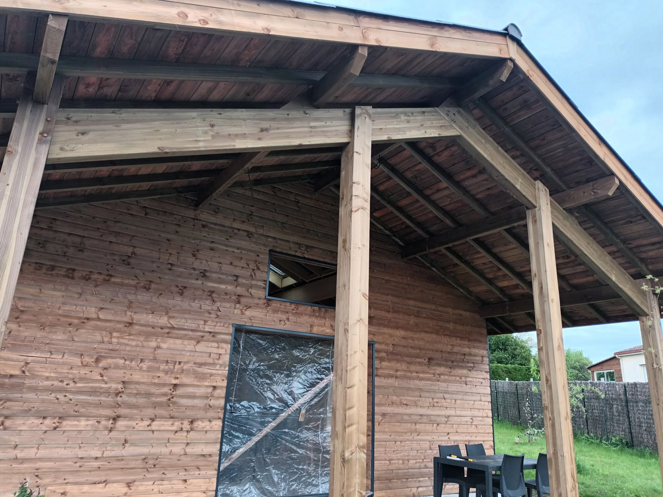Structure en bois Douglas avec couverture en bac translucide pour une luminosité naturelle.