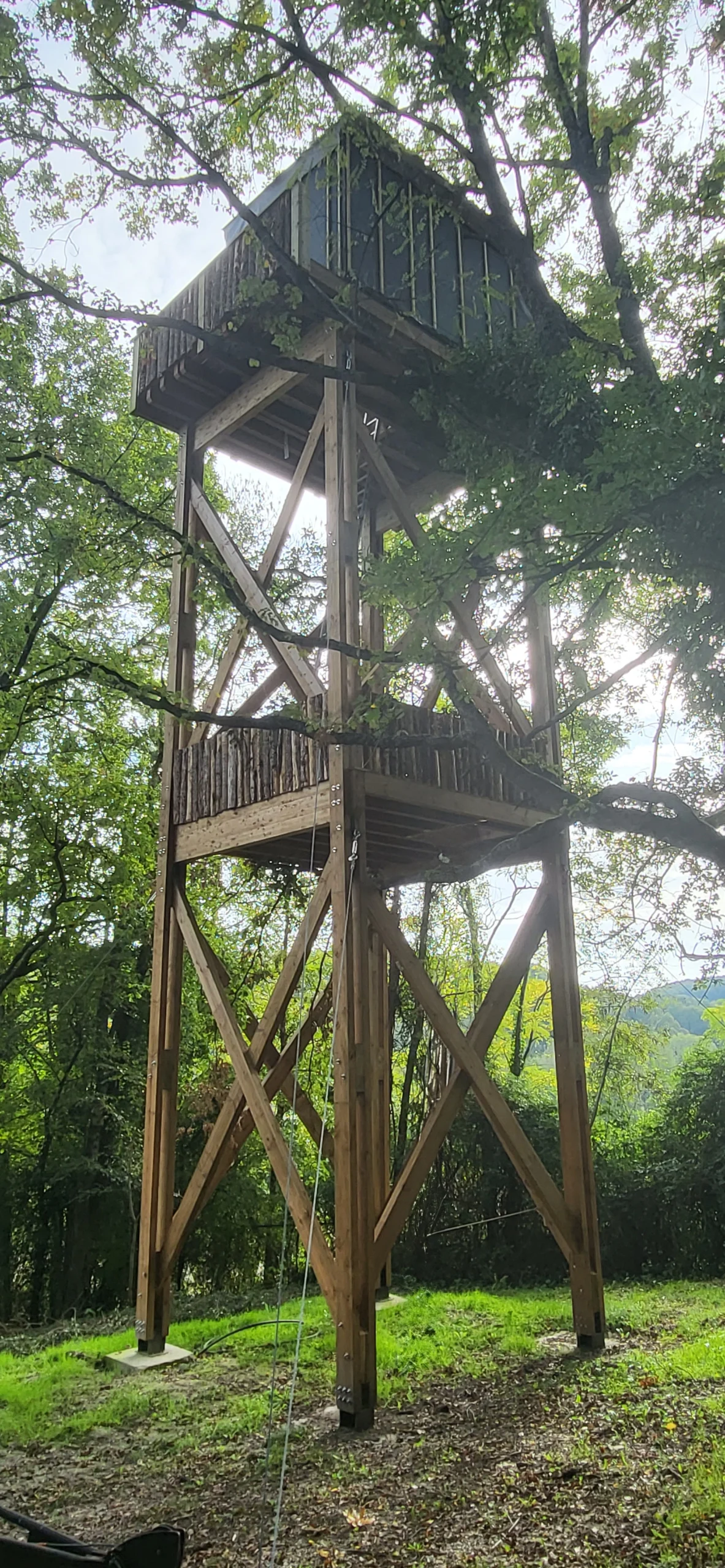 13 m de haut en bois douglas français et acier, avec garde-corps en dosses pour l’esthétique. Conçu et fabriqué à 100 % par SIGA