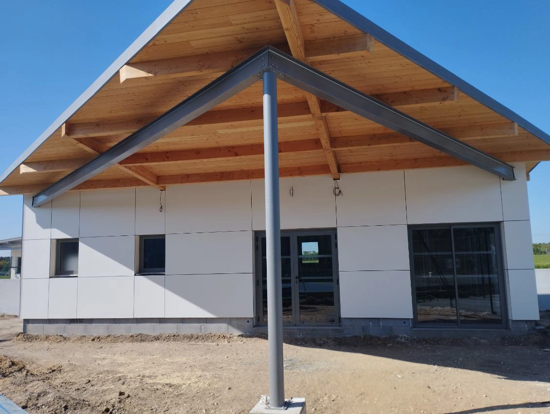 Lot 02 : charpente, couverture, zinguerie et murs ossature bois isolés en fibre de bois. Charpente mixte métal/douglas avec caissons toiture préfabriqués.