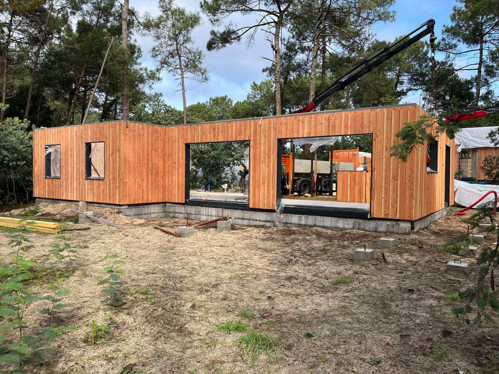 192 m² de murs en épicéa 145 mm, bardage épicéa/douglas français traité marron, charpente traditionnelle en douglas et couverture fibres-ciment.